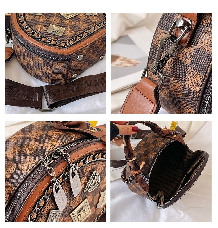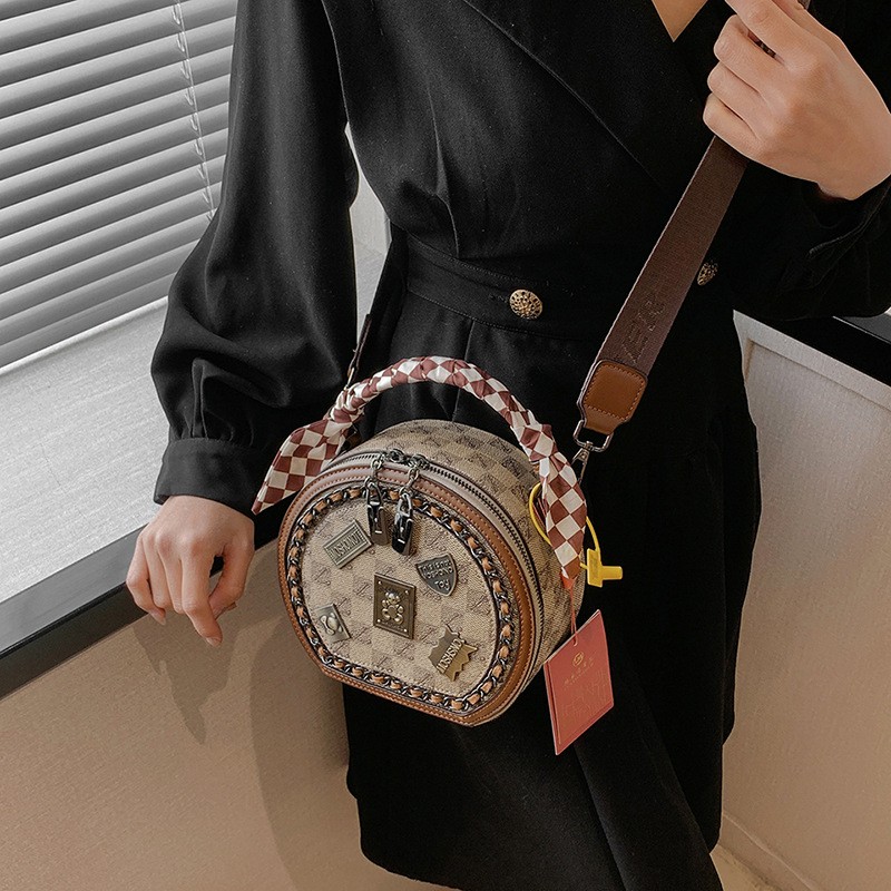 Cross-border retro textured round cake bag for women spring 2025 new fashion badge silk scarf handbag versatile crossbody bag